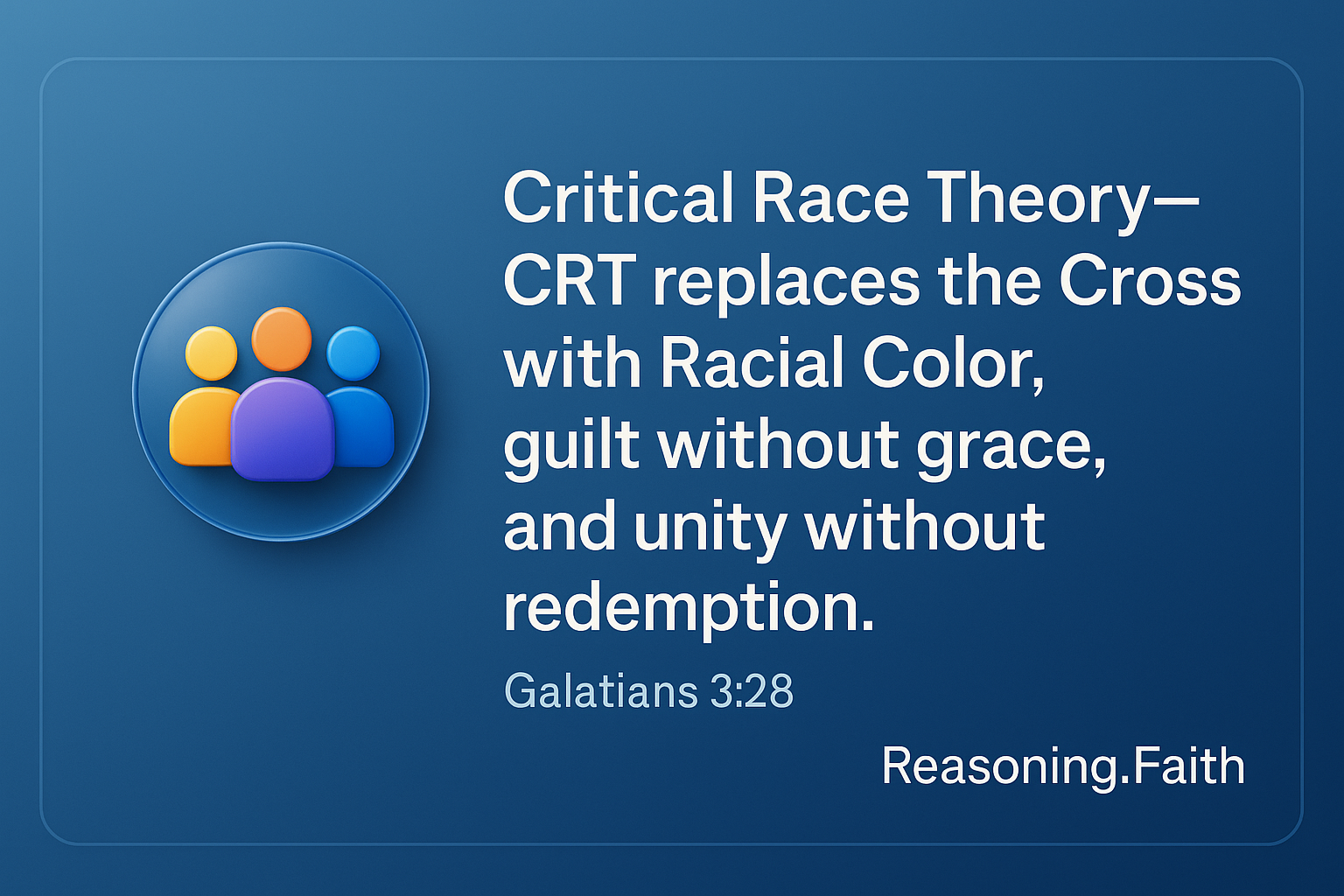 CRT is not a neutral social theory — it’s a rival worldview that replaces sin with skin and salvation with social activism. It denies biblical anthropology (that all are equally sinful and redeemable), and it elevates collective identity above individual moral responsibility.In short: CRT replaces the cross with color.