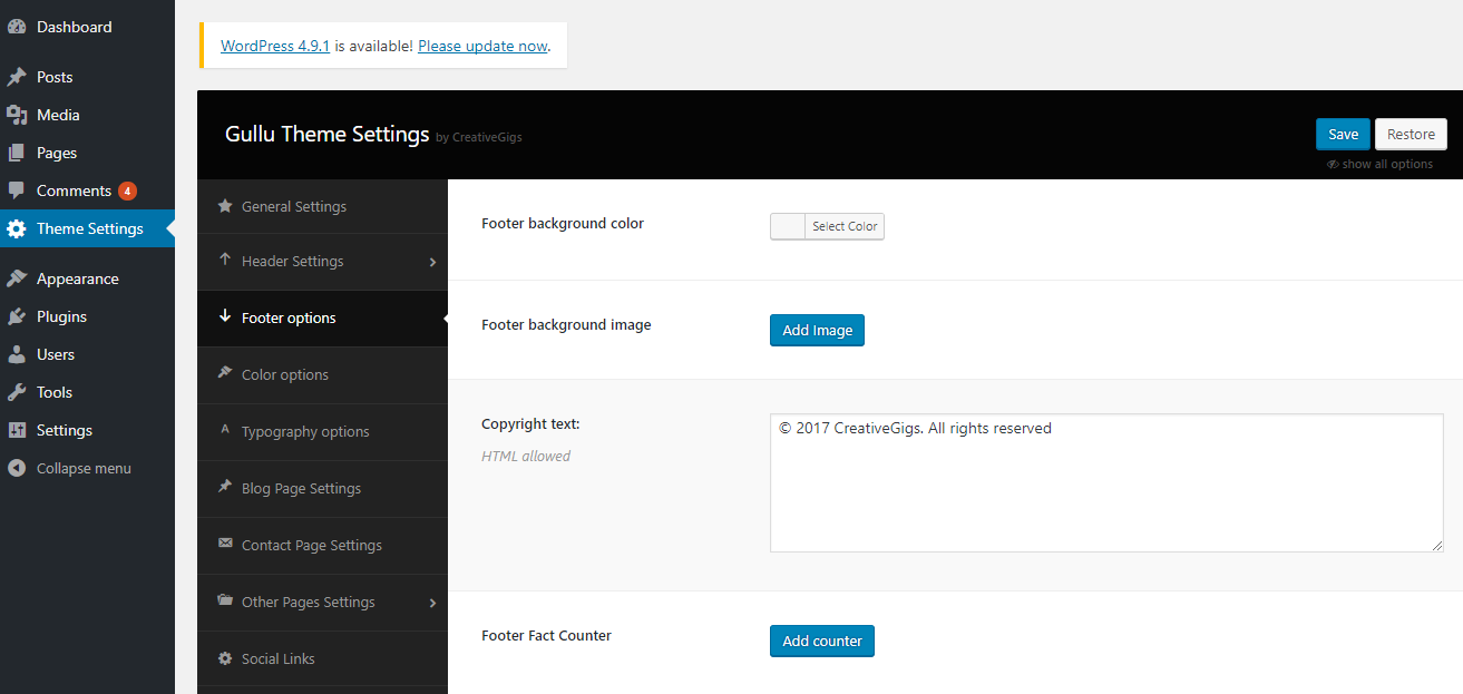How to edit the theme Footer? You can change the theme default Footer color and other styling (including Footer Fact Counter) from Theme Settings > Footer Settings. And you can set the footer widgets from Appearance > Widgets. Put your footer widgets into the Footer Widgets sidebar area.