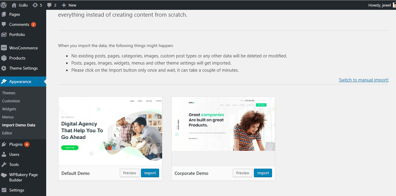 However, you will get all demo content data with the theme package. You will find the demos in ‘rogan>inc>demos this path. If you failed to import the demo content with one click then you have to follow the below steps to import the demo content manually.
