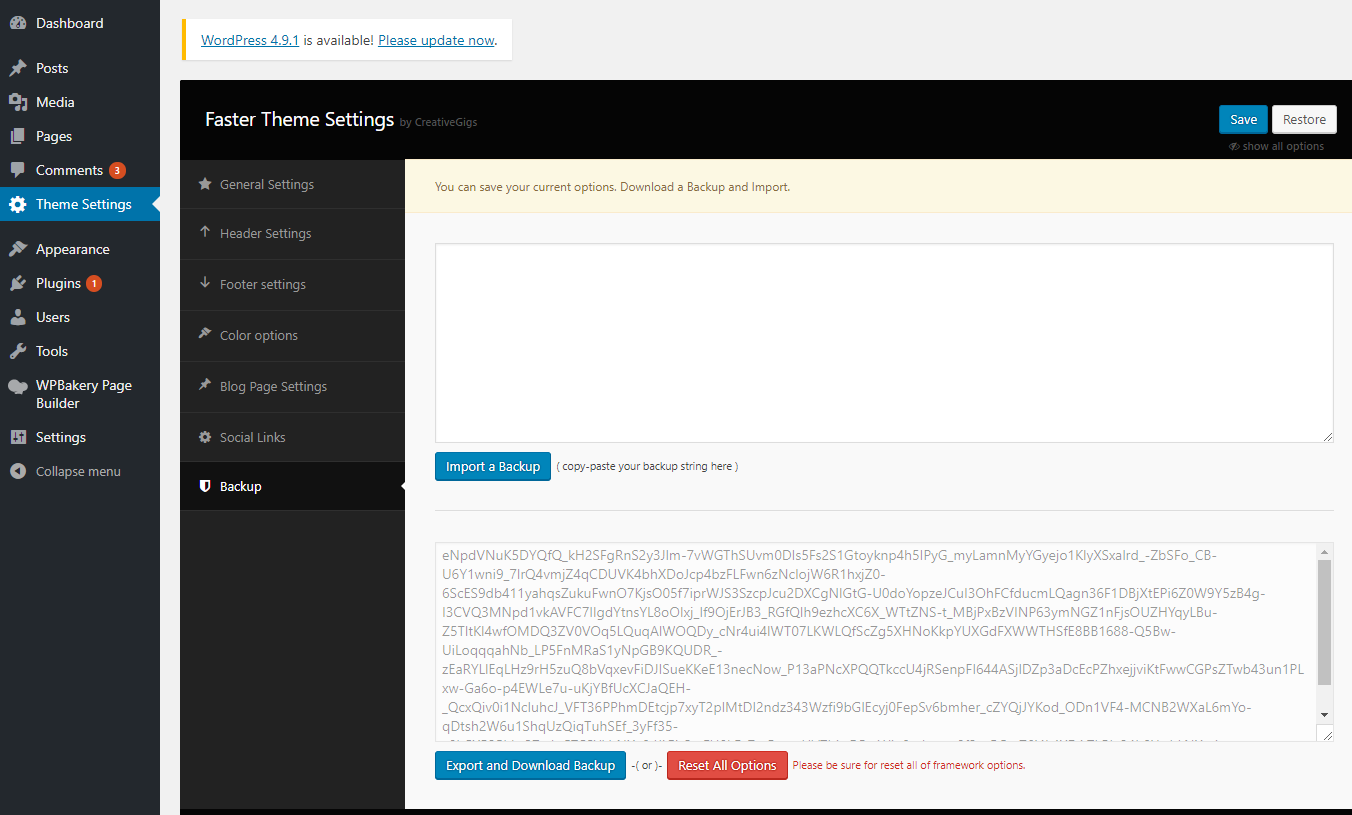 - Now you have to import the Theme Settings as like the demo. Navigate to ‘Theme Settings > Import / Export‘. Then click on the Import from File button and copy-paste the backup string here and click on the Import a Backup button. You will find the backup string in the settings.json file.