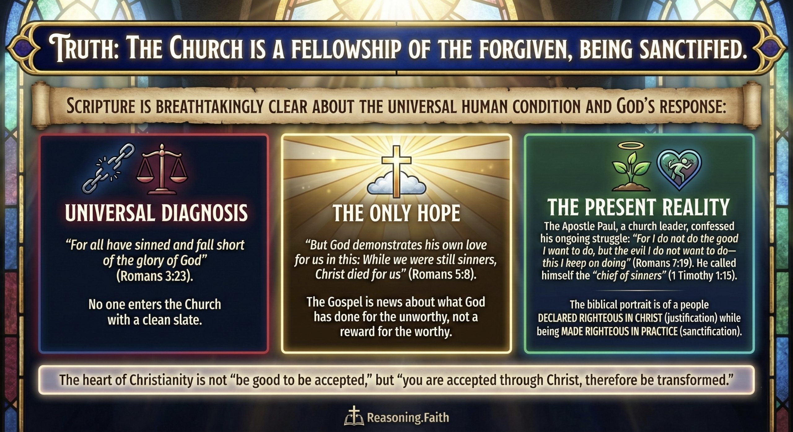 Truth: The Church is a fellowship of the forgiven, being sanctified.